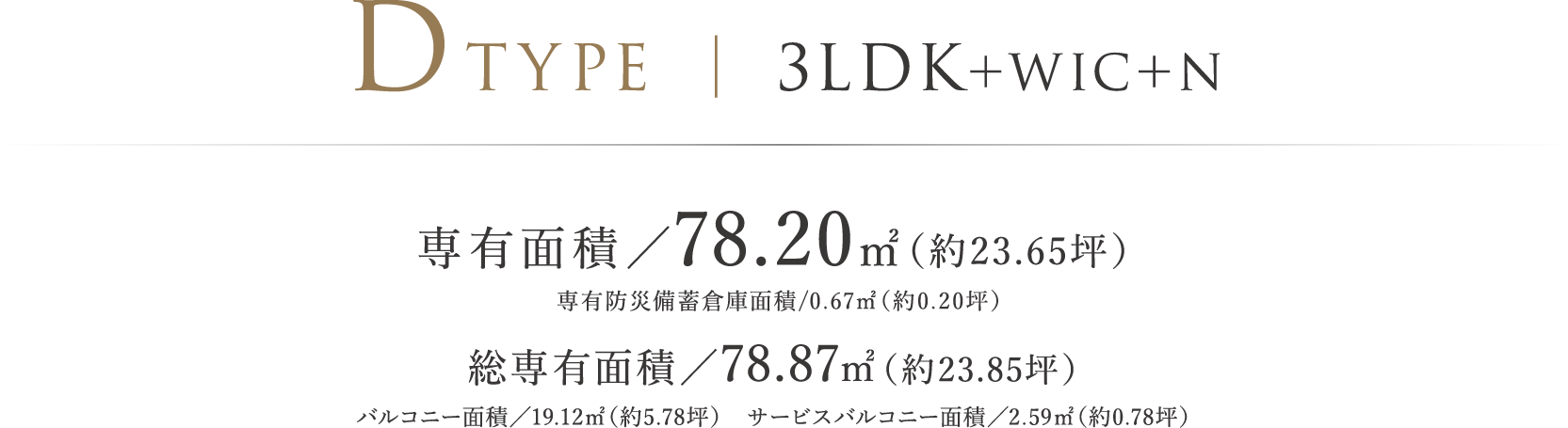 DTYPE | 3LDK+WIC+N 専有面積/78.20㎡(約23.65坪)専有防災備蓄倉庫面積/0.67㎡(約0.20坪)  総専有面積/78.87㎡(約23.85坪)バルコニー面積/19.12㎡(約5.78坪) サービスバルコニー面積/2.59㎡(約0.78坪) DTYPE | 3LDK+WIC+N 専有面積/78.20㎡(約23.65坪)専有防災備蓄倉庫面積/0.67㎡(約0.20坪)  総専有面積/78.87㎡(約23.85坪)バルコニー面積/19.12㎡(約5.78坪) サービスバルコニー面積/2.59㎡(約0.78坪)